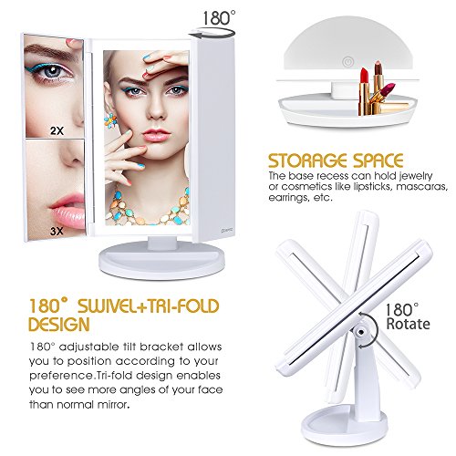 - [1X/2X/3X MAGNIFICATION] 3 panels magnifying and wide-angle viewing allow you to see clearly your facial features and make a more perfect makeup with every detail being taken care of. Certified by FCC, CE and RoHs, high-quality coatings and finely polished finish for excellent use experience.