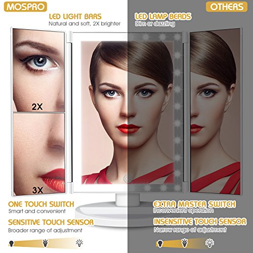 - [UPGRADED LED LIGHTS] 4 tubular light bars are adopted. Comparing with the general lamp bead makeup mirrors, MOSPRO light strip makeup mirror is free from dazzling and can protect your eyes by providing softer, brighter and more natural light.
