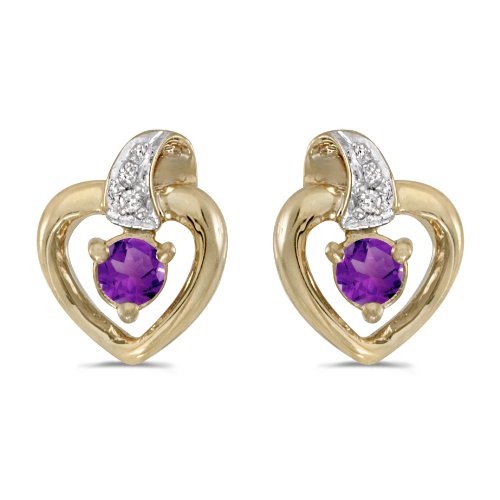 These 14k yellow gold round amethyst and diamond heart earrings feature 3 mm genuine natural amethysts with a 0.16 ct total weight and two bright diamonds.