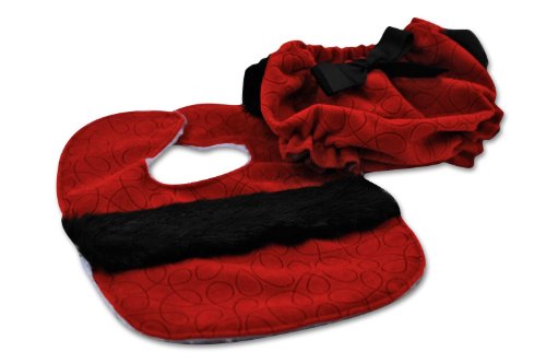 This bib and bloomer set by Caught ya Lookin' will have your baby looking cute and stylish for this holiday season. This Santa bloomer and bib set has a red curly-Q microfiber with black faux fur. The bib has a velcro closure and the bloomers have elastic bands. Machine washable. One size. Made in USA.