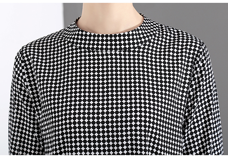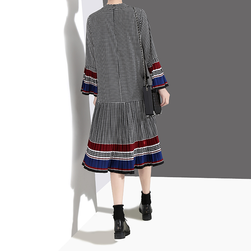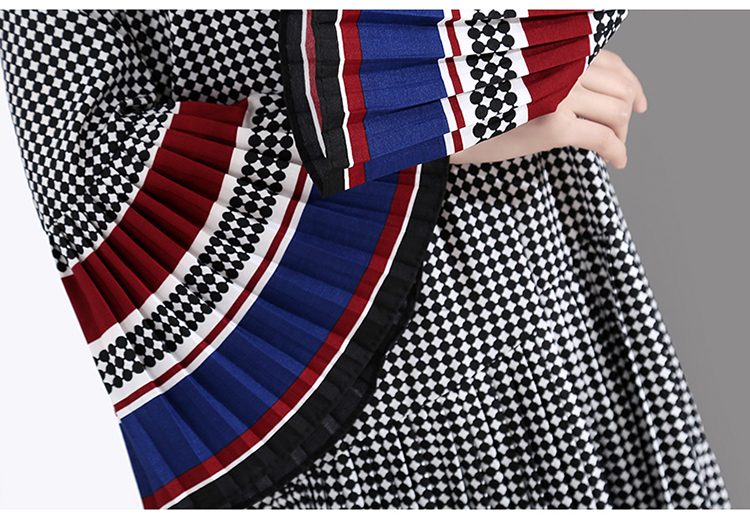 ワンピース 長袖 ひざ下丈 ドットトランペットスリーブ スタンドカラー トリコロール プリーツ