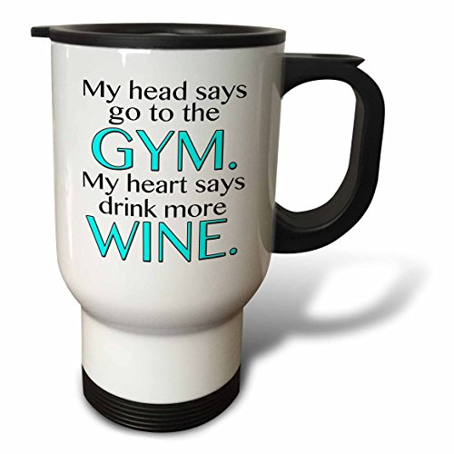 3dRose tm_173358_1 My Head Says Go to The Gym My Heart Says Drink More Wine Turquoise Travel Mug, 14 oz, White