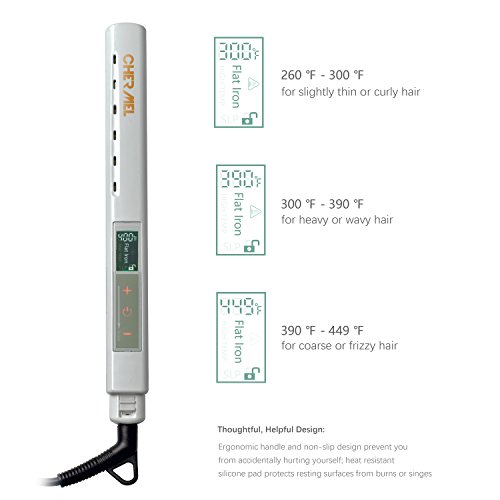 PTC heating, adjustable temperature from 260F to 449F to suit all hair types, which is worldwide dual voltage compatible 110V-220V