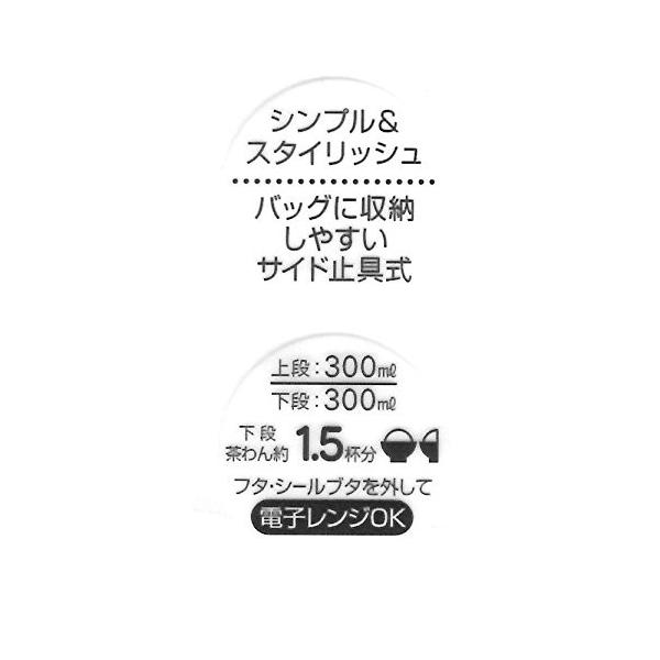 | 商品の説明 | サイド止具式でバッグに引っ掛かりにくく収納しやすい弁当箱 お弁当箱下段に入るご飯の量は、お茶碗(約200ml)約1.5杯分 学生やOL、大人の女性にもちょうど良い600ml容量 シンプル構造で壊れにくく丈夫で、洗いやすいランチボックス |