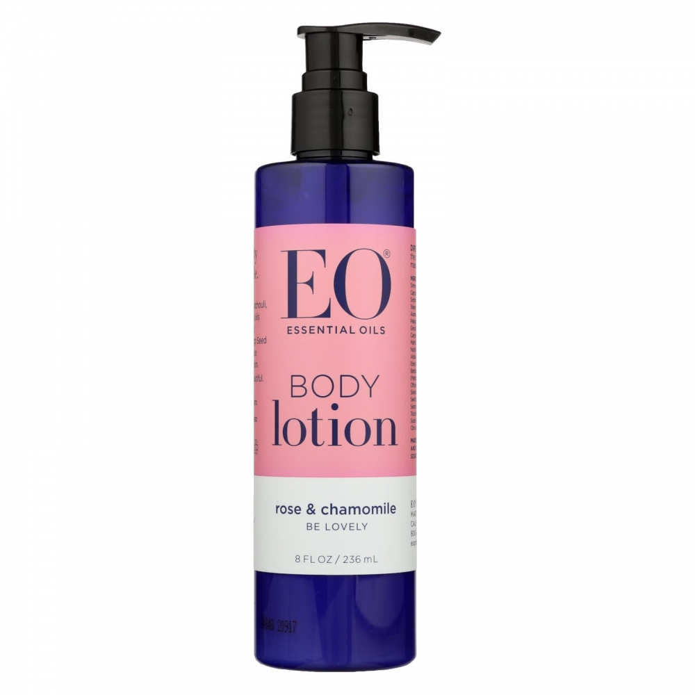 | EO Essential Oil Products Everyday Body Lotion Rose and Chamomile Description: For All Skin Types A nourishing and protective moisturizer that applies easily and is quickly absorbed leaving skin smooth and soft. Very precious Rose Essential Oils and Chamomile combine to nurture and calm. Rose Essential Oils restore and rejuvenate skin Oat Betaglucan moisturizes and soothes irritated skin and promotes skin firmness Rice Proteins penetrate deeply to diminish fine lines Vitamins E and A improve skin elasticity with powerful antioxidants Mango Seed Butter and Olive Wax moisturize and protect skin Organic Jojoba Oil lightly conditions skin restoring softness naturally Organic Calendula, Chamomile and White Tea botanicals harmonize and nourish skin Long held as a symbol of purity, the lotus flower is an inspiring gift of nature. Found in murky waters, the lotus produces blossoms that are radiant and pure.