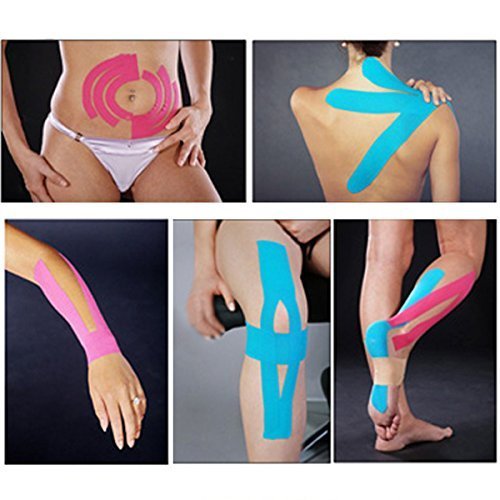-. Feature : Stickier, hypoallergenic, water resistent adhesive that won't fall off during competition / Promotes blood flow and aids in recovery. / 160-180% elasticity,helps reduce skin irritation. Also allows fuller range of motion / Reduce or eliminate pains and strains. No medication. Full range-of-motion. / Treat your muscle pain