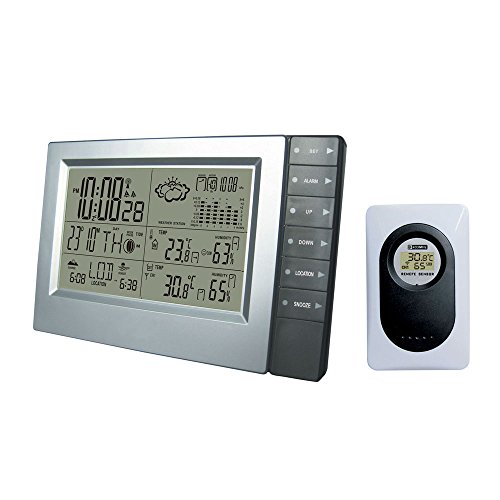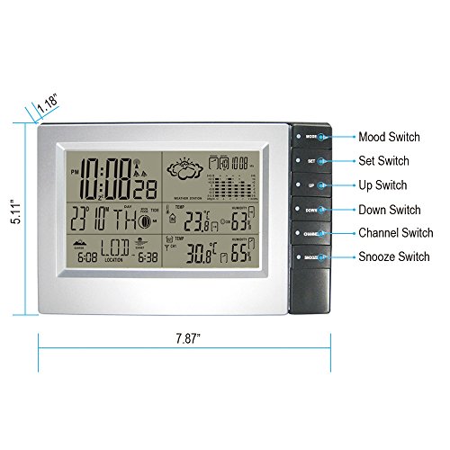 -. Feature : The outdoor sensor displays the temperature and humidity. And wirelessly transmits the temperature and humidity levels to the indoor main unit.MIN/MAX records of IN/OUT Temperature & Humidity, / WWVB self setting time and date with automatic daylight saving time updates / The weather station's main console displays a wide range of information in an easy-to-read format on a large LCD and can be Wall-mounted or can stand-alone with the built-in stand. / Monitors Temperature, humidity,as well as barometric pressure (both sea-level and measured), and features a pressure history chart to track trends. / Calculates Sunrise/sunset based on selected city name & Moon Phases & Temperature Alert
