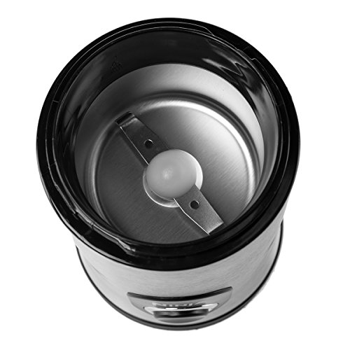 Brushed stainless steel and black plastic; Fast grinding blades for fresh roasted taste; Clear top easy to see when beans are ground
