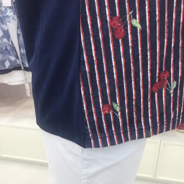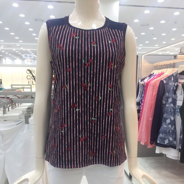 신축성 있는 레이스 원단에 프린트를 찍어 부드럽고 시원한 소재감이 돋보이는 슬리브리스 티셔츠.