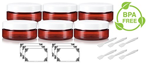 4 oz / 120 ml Amber PET Plastic (BPA Free) Refillable Extra Low Profile Jar with White Lid (6 PACK) + Spatulas and Labels