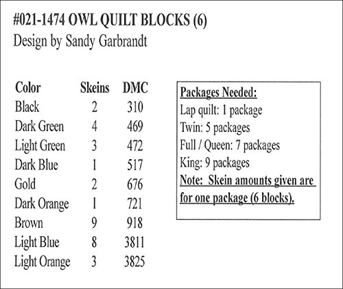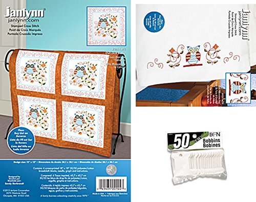 - INCLUDES: 1 kit of 6 stamped embroidery Owl quilt blocks (021-1474), 1 kit of 2 stamped embroidery Owl pillowcases (021-1478) and 1 package of 50 heavy cardboard floss bobbins (3002-01)