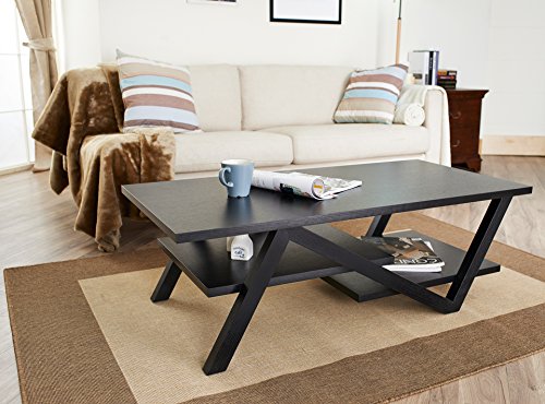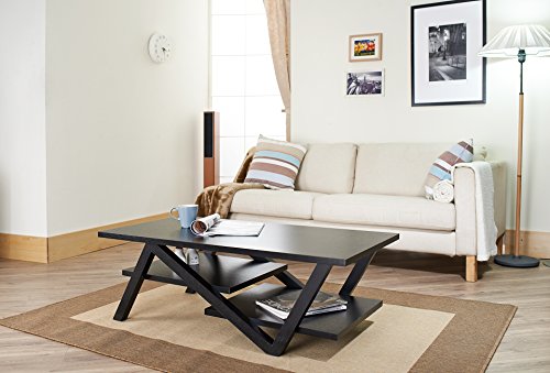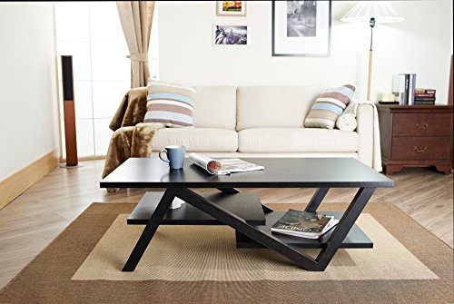 - Feature : Modern coffee table offers two shelves for display and a large rectangular table top panel / Product is made of medium fiber board construction; laminate black finish / Rectangular shape coffee table; two bottom shelves for display; Z-shape support legs; low profile modern design / Assembly required by two adults; To clean, use damp cotton cloth to wipe clean; Made in China / Measures 47.25-inch wide by 23.25-inch deep by 15.50-inch high; 30-days hassle-free replacement parts warranty