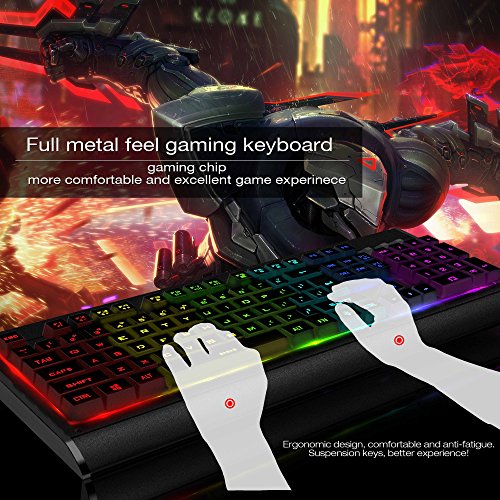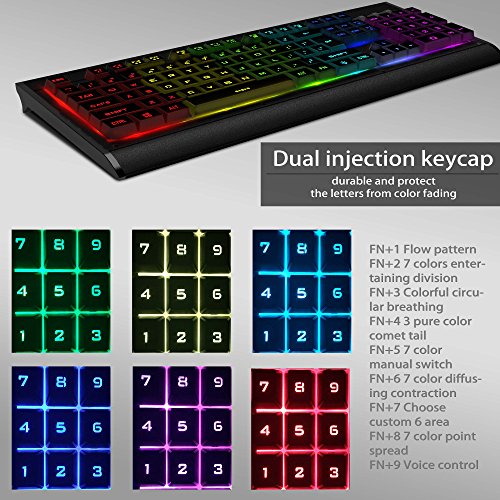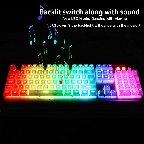 -. Feature : Voice control: Seven Color Voice keyboard,voice clear and strong sence of rhythm,Suitable for all kinds of people, especially for gamer. / Backlit Switch: Pressing Fn + 1-9 LED Backlit can be presented with nine kinds of changes,if clicks Fn+9 the backlight will dacing with the music. / Gamer's Equipment: Support 19 keys under USB mode without conflict, provide Fn+Win_Llock WIN function under USB mode ,It could provide the realizing multimedia keys function ,Especially for gamers. / Fashion Look: metal base designed and enhanced weight to keep your keyboard in a better gaming experience , Gilded interface can insure a large degree guarantees stable data transmitting. / Compatible with Windows 10, 8, 7, Vista, XP,IOS, Linux or later operating system.