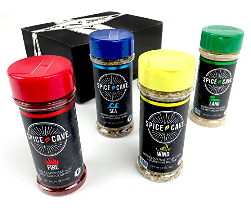 -. Feature : Includes one 3.8 oz bottle of Spice Cave FIRE Seasoning, one 4.0 oz bottle of Spice Cave LAND Seasoning, one 3.8 oz bottle of Spice Cave WATER Seasoning, and one 3.2 oz bottle of Spice Cave WIND Seasoning / Gluten Free, Paleo, Non-GMO, Whole30 / Made in the USA / In a BlackTie Box