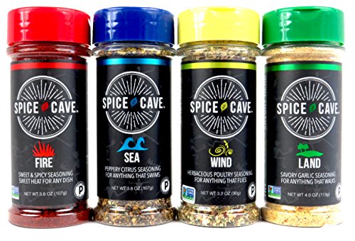 -. Title : Spice Cave Seasonings 4-Flavor Variety: One 3.8 oz Bottle of FIRE, One 4.0 oz Bottle of LAND, One 3.8 oz Bottle of WATER, and One 3.2 oz Bottle of WIND in a BlackTie Box (4 Items Total)