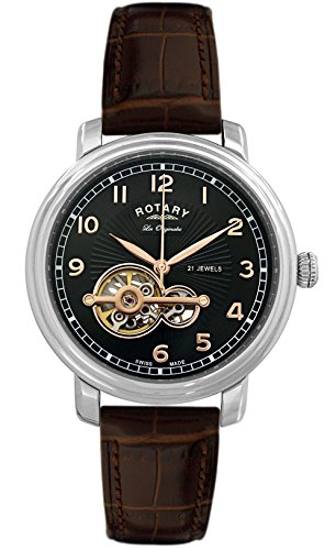 -. Feature : Polished Silver Stainless Steel Case 40 MM x 14 MM Thick - Fixed Bezel - Black Sunray Stamped Dial - Sapphire Crystal On Both Sides - Rose Gold Hands & Rose Gold Numerical Hour Indicators / Genuine Brown Leather Band With Silver Pin Buckle - 18 MM Wide x 7.75 Inches Long - Adjustable To Fit 5.75 - 7.75 Inch Wrists - Not Resizable / Hour, Minute, Second Functions / Water Resistant to Rotary's Dolphin Standard. Suitable For Swimming & Diving / Swiss Made Mechanical Movement Caliber R.1000.21