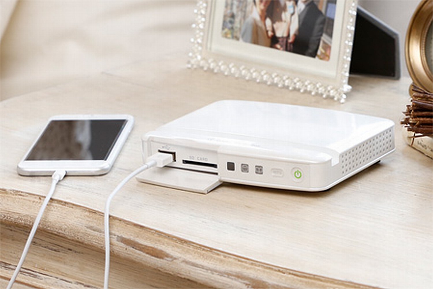 Simply plug in a smartphone or insert an SD card, you can automatically save and organize photos.
