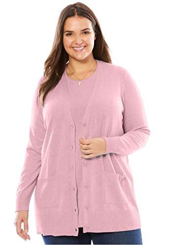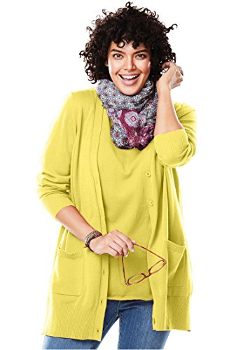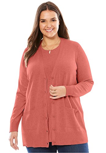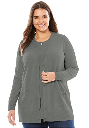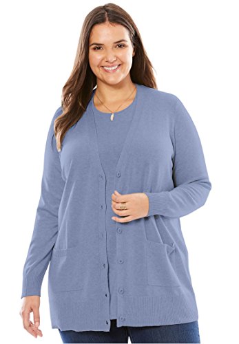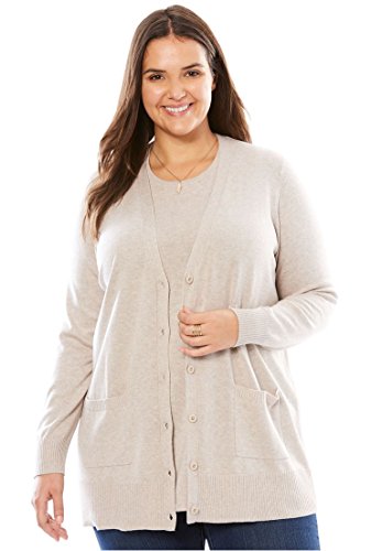 Studio : Woman Within Publisher : Woman Within Binding : Apparel Product Description " A plush texture and a comfortable generous fit make this plus size sweater the perfect ""boyfriend"" cardigan layer, in many rich colors to choose from. comfortable, relaxed fit 30"" length falls to the upper thigh V-neck with button placket long sleeves 2 front patch pockets soft, washable cotton/acrylic imported Women's plus size cardigan in sizes M(14W-16W), L(18W-20W), 1X(22W-24W), 2X(26W-28W), 3X(30W-32W), 4X(34W-36W), 5X(38W-40W) The Comfort FactorOur styles are designed with you in mind using plus size models to ensure sizing, proportions comfort. We've been refining our measurements for over 100 years so you can be confident the fit will be just right for you. " 0