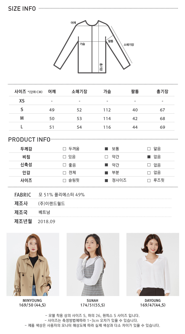 - 적당히 여유있는 핏감으로 어떤이너와도 코디가 용이합니다.