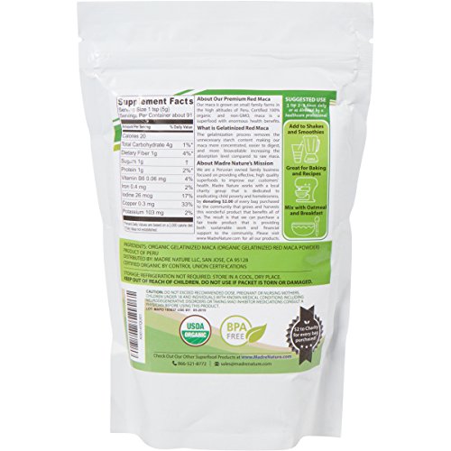 This gelatinized Red Maca is easier to digest, and won't cause bloating, gas or upset stomach. They are easy to take with you for travel or work, and you also get a precise dose every day. With Madre Nature, you always get the very best!