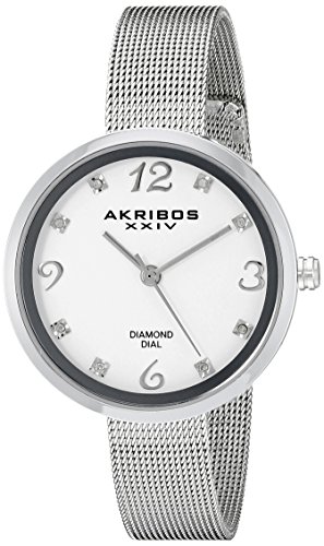Studio : TWI Watches, LLC Publisher : TWI Watches, LLC Binding : Watch Product Description This beautifully crafted AKRIBOS XXIV Women's timepiece features a lovely 34mm silver tone case with a high polished bezel. Inside its petite form is a reliable Miyota quartz movement, which powers the classic two-hand complication. Each of the Arabic numerals and genuine diamond markers are hand-applied to the white dial, and the stainless steel mesh bracelet is the perfect finish for this elegant timepiece. 0