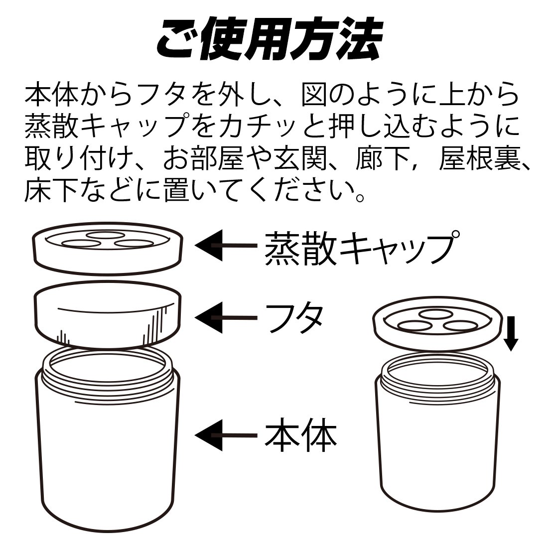 How to use Remove the lid from the main body and install it so that the transpiration cap is clicked from above as shown in the figure, please put it in the room, entrance, corridor, attic, under the floor etc.