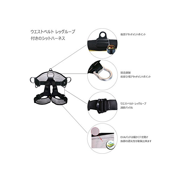 웨스트 벨트나 레그 룹 딸린 안전형 하네스:와이드가 된 웨스트부와 레그가 요부와 레그를 확실히 고정,보호 할 수 있습니다.남성,여성,청소년과도(모두) 폭넓게 쓸만할 수 있는 안전형의 sit 하네스입니다.
