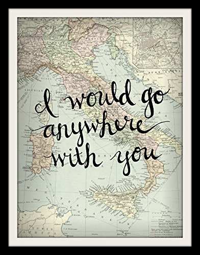 This listing is for an 8x10 inch print of my original artwork featuring the romantic quote "I would go anywhere with you." The saying is hand lettered in black over a background of a vintage map of Italy. This artwork makes a great gift for someone you'd go anywhere with!
