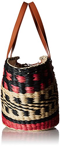 Woven basket tote in geometric pattern featuring complementary leather handles with metallic hardware