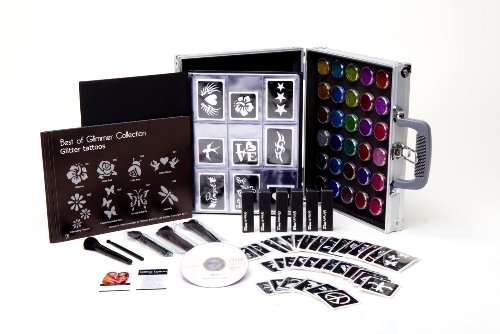 -. Binding : Misc. -. Brand : Glimmer Body Art -. Feature : 1 Cosmetic Glitter Palette, 30 Glitters (.26 oz / 7.5 g), 6 Glimmer Glue (10ml) / 300 Self Adhesive Stencils (100 designs from Stencil Set 1 & 2 - 3 Stencils per design) / 4 Sets of Glitter Tattoo Brushes - Specially designed to pick up & paint-on glitters. / 75 Care Cards, 1 Hard Carrying Case with 2 keys / 1 Glimmer Care Instructional DVD -. Label : Glimmer Body Art -. Manufacturer : Glimmer Body Art -. Model : PPKR -. MPN : PPKR -. PackageQuantity : 1 -. PartNumber : PPKR -. ProductGroup : Beauty -. ProductTypeName : BEAUTY -. Publisher : Glimmer Body Art -. Studio : Glimmer Body Art -. Title : Glimmer Body Art Professional Glitter Tattoo Artist Kit