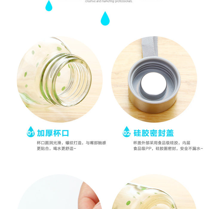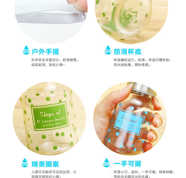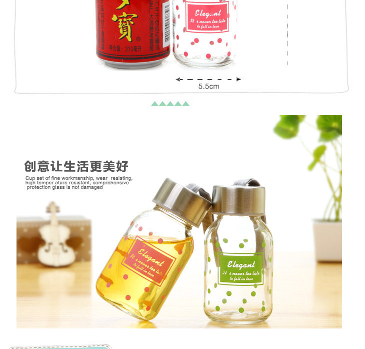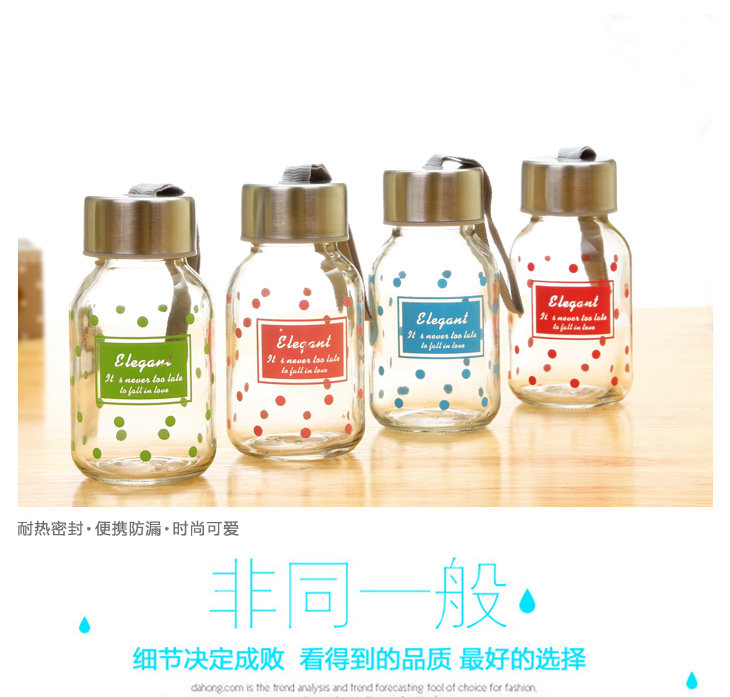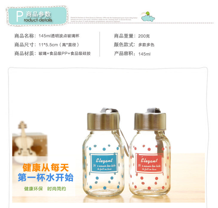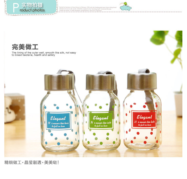| Product Description | Polka Dot small transparent glass is 145ml, small floral transparent glass sealed lid, outer and inner stainless steel food grade PP from a system of hand-tighten the lid, embedded silicone ring, good sealing, easy to carry, the cup rounded and smooth mouth, drink more comfortable, the thread to create consistent and lid, tighten the lid will not spill, exquisite glass cup as monotonous increase in the unlimited fun, cute little mug on the bag not of space, but also on the clothes going round any time to add moisture, very convenient oh! |
