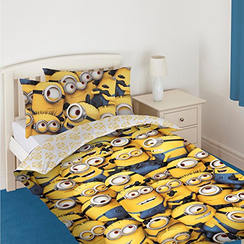 Product Description This official Despicable Me Minions Single Duvet Cover Pillowcase Set features dozens of adorable Minions all over it. As it is made from 50% cotton and 50% polyester, the bedding set is super soft so your little one will love snuggling down with the Minions each night. This item can be machine washed and is also suitable for tumble drying on a low setting. 0