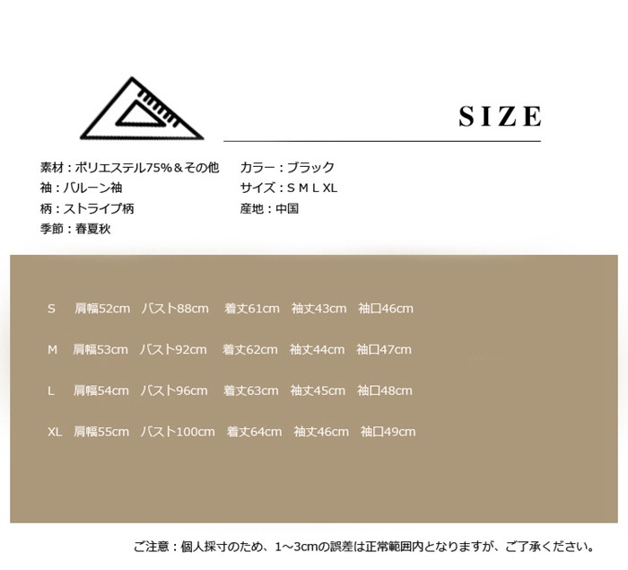 シャツ レディース 長袖 ブラウス フォーマル トップス 大きいサイズ 無地 白 黒 シャツ ブラウス フォーマル 通勤 オフィス カジュアル 2018春秋新作商品詳細素材:ポリエステル75%&その他袖:バルーン袖柄:ストライプ柄季節:春夏秋カラー:ブラックサイズ:S M L XL産地:中国サイズ参照表S 肩幅52cm バスト88cm 着丈61cm 袖丈43cm 袖口46cmM 肩幅53cm バスト92cm 着丈62cm 袖丈44cm 袖口47cmL 肩幅54cm バスト96cm 着丈63cm 袖丈45cm 袖口48cmXL 肩幅55cm バスト100cm 着丈64cm 袖丈46cm 袖口49cmご注意:個人採寸のため、1~3cmの誤差は正常範囲内となりますが、ご了承ください。シャツ レディース 長袖 ブラウス フォーマル トップス 大きいサイズ 無地 白 黒 シャツ ブラウス フォーマル 通勤 オフィス カジュアル 2018春秋新作