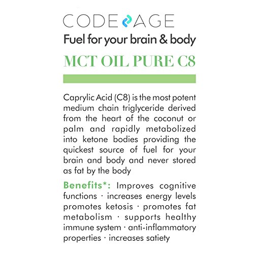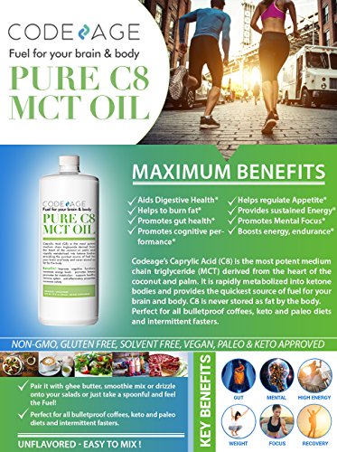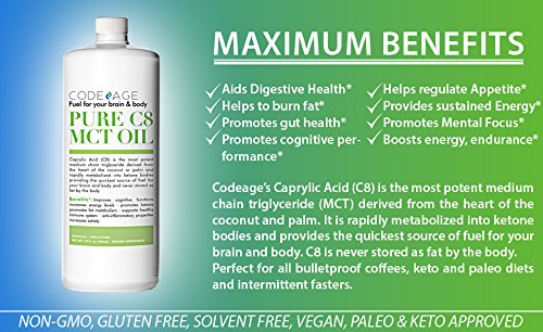 -. Feature : ✅PURE 100% C8 MCT OIL, NOTHING ELSE: Our triple distilled pharmaceutical grade MCT Oil is the most potent MCT Oil available on the market. No fillers, additives, solvents or chemicals and completely flavorless, it contains only the rarest medium chain triglyceride: Caprylic Acid. Third-Party tested, sustainably harvested and Made in a GMP Certified Facility in the USA, it is the cleanest and purest product available! / ✅BOOST ENERGY, ENDURANCE & COGNITIVE PERFORMANCE : Our MCT Oil Pure C8 is instantly converted into sustainable energy for your brain, body and muscles throughout the day without the crash for optimal cognitive and physical performance. Feel more energized than ever, longer than ever and stay active throughout the day. Accomplish more at work, perform better in the gym, reach your true potential! / ✅HELP BURN FAT & ENHANCE DIGESTION: Our MCT's Produce 4x more ketones than other coconut oils getting you into ketosis faster and elevating your ketone levels where your body burns fat as the P.R.Imary source of energy. An effortless way to loose weight while having sustained energy throughout the day! MCT's also have significant antibacterial and antiviral properties promoting gut health by killing bad bacteria while preserving the good for optimal gut, intestinal and digestive health! / ✅RAZOR SHARP MENTAL FOCUS: Caprylic Acid is Pure Brain fuel for Optimal Cognitive Performance. Feel more alert and think clearly throughout the day and unleash that creativity! / ✅NON-GMO, GLUTEN FREE, SOLVENT FREE, VEGAN, PALEO & KETO APPROVED: Perfect for all bulletproof coffees, keto and paleo diets and intermittent fasters. Pair it with ghee butter, smoothie mix or drizzle onto your salads or just take a spoonful and feel the Fuel! Most brands are either a blend of C8 and C10 or C8, C10 and C12. Not this oil! Add to cart and raise your game!