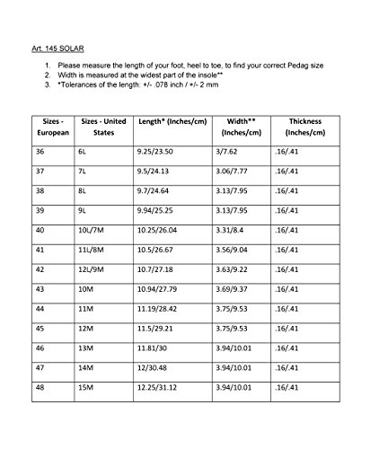 ReleaseDate : 2008-09-15 Studio : Pedag Publisher : Pedag Binding : Health and Beauty Product Description Pedag SOLAR: The winter insole that provides effective insulation. 3 layers of insulation combine to keep body heat from escaping through the soles of your shoes or boots. The upper layer is pure quilted wool which is durable, comfortable and provides a little warmth. The middle layer traps body heat with thousands of air bubbles encapsulated in high tech foam. The bottom layer is a special aluminum reflector that keeps cold from penetrating and heat from escaping. Solar keeps feet warm yet it is thin enough to fit into most normal comfort type shoes and boots. Solar is a flat insole that will also provide a little cushioning. For a full orthotic insole with the same 3 layers of insulation see Pedag Viva Winter. 0