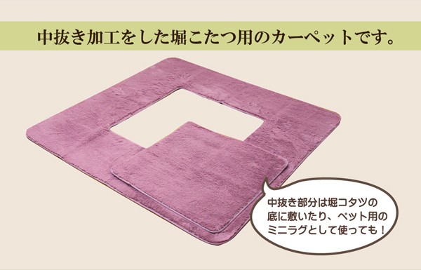 掘りごたつ対応のカーペットです。カラーは選べる多色展開です。表地にフィラメント糸(極めて長い繊維)を使用しています。遊び毛が出にくく、耐久性に優れています。パイルの長さは約18mmと適度な長さで、さらさらふわふわとしたやさしいタッチ感を出しました。フローリングを傷つけにくいよう、裏には不織布を貼っています。※くり抜き部分もお届けします。※職人が手作業でくり抜き加工を行いますので、サイズには多少の誤差が生じます。ご了承下さい。