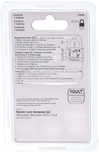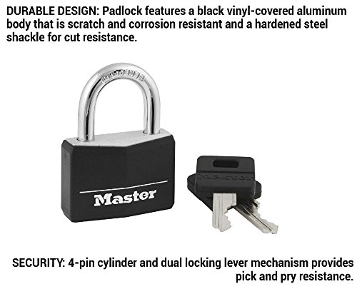 DURABLE DESIGN: Padlock features a black vinyl-covered aluminum body that is scratch and corrosion resistant and a hardened steel shackle for cut resistance