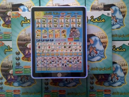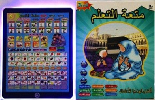 Mainan playpad Muslim, untuk anak-anak belajar shalat, huruf hijaiyyah dan doa harian. Dioperasikan dengan tiga baterai AA.