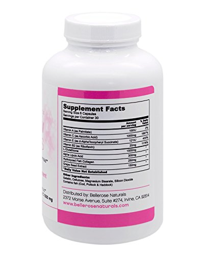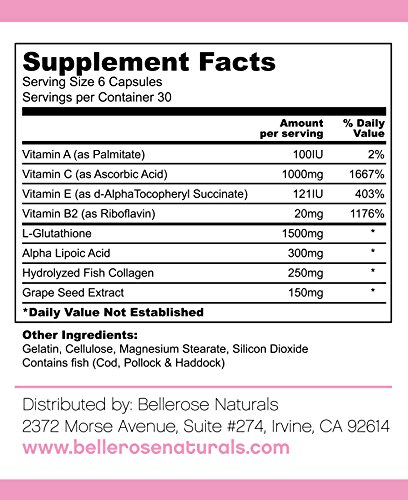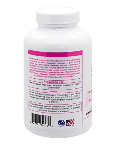 -. Feature : Specifically capsuled with 1500 mg Glutathione and 1000 mg Vitamin C in each serving / Improve skin complexion, boost immune system, detoxify liver, protect cells from free radicals / Enhance skin protection against discoloration & hyperpigmentation / Alpha Lipoic Acid, Fish Collagen, Grapeseed Extract are added to maximize rejuvenating benefits / SNOW CAPS gives you your young and radiant look in the healthiest way!