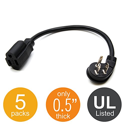 BH 1-Foot Low Profile Angle Extension Power Cord 16 AWG (5 Packs) NEMA 5-15P to 5-15R UL Listed CSA Approved