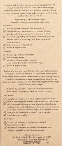 An oil-free, high definition, high performance foundation that "stays all day" and delivers a flawless finish. Unique oxygen technology leaves skin hydrated, nourished and helps prevent premature aging. This foundation glides onto skin, immediately going to work to help minimize skin blemishes and imperfections. This dreamy formula glides onto skin and immediately goes to work to help minimize skin blemishes and imperfection. It is also enriched with an array of skin loving ingredients, and unlike other long-wearing formulas, includes a synergistic combination of botanical extracts that have been shown to help enhance circulation and blood flow, resulting in an increase of oxygen being delivered to the skin and letting skin breathe. These innovative extracts also help to slow down the onset of premature aging and promote healthy, hydrated and vibrant skin. This multi-tasker also contains a creamy, full coverage concealer cleverly hidden inside the cap (along with a handy mirror) that instantly hides blemishes, dark circles and age spots creating an impeccable canvas for flawless makeup application. Product also comes with a spatula and brush for ease of application.Feature