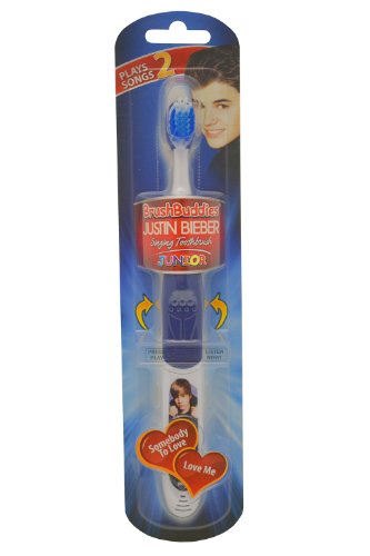 Justin Bieber junior singing toothbrush, featuring somebody to love and love me. Justin Bieber junior singing toothbrush features soft dupont bristles toothbrush features include a replaceable batteries. Egronomic design. BPA free.