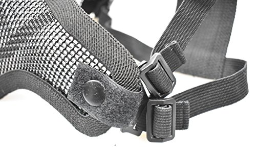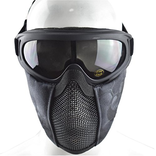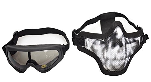 -. Feature : Materials, Green Environmental low carbon steel, Goggles: ABS (Acrylonitrile Butadiene Styrene) plastic / Metal Mesh Face Mask that Provides Superior protection for the face / Design of Double Strap and Wearing more stable,Fully Adjustable with Elastic Strap to fit most people (Kids and Adults) / Protective half face mesh mask Compatible with most eyes protection glasses / Perfect for war game, paintball, hunting and military purpose
