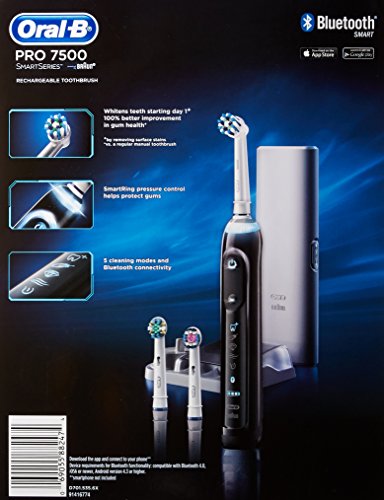 Studio : Procter Gamble - HABA Hub Publisher : Procter Gamble - HABA Hub Binding : Health and Beauty Product Description The Oral-B SmartSeries 7500 Power Rechargeable Electric toothbrush with Bluetooth connectivity gives you healthier gums, stronger teeth for life. Bluetooth communication allows the brush to connect with your smartphone to give you real-time feedback on your brushing habits. With 5 unique modes and a customizable SmartRing pressure sensor that lights up when you brush too hard, the Oral-B Pro 7500 will transform the way you brush. You can even customize the pressure sensor's color! Best of all it's brought to you by Oral-B - the #1 brand used by dentists worldwide. use as directed with a fluoride toothpaste 0