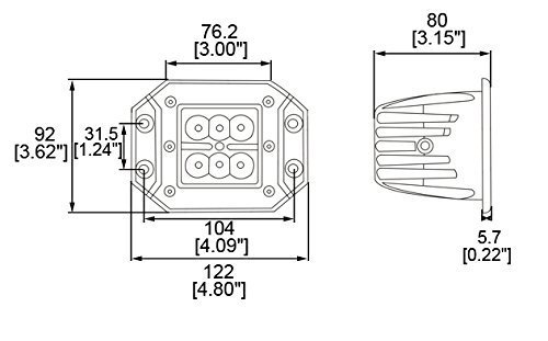 1 pc 3" Square Flush-Mount 18W Heavy Duty High Powered CREE XLamp LED Work Light. Input voltage is 10-30V DC. Power Consumption: 18 watts. Luminous flux output is 1620 Lumens. Use 6 x 3W High Power LEDs. Optional Color(s): Cool White. Viewing Angle: 8 Degree. Product Dimension: 122mm x 92mm x 80mm. Die-casting aluminum material. Waterproof IP67 Protection Rating. Low engery, High flux output and Long lifetime. For Use in LED fog lights, Driving LED lights, Off road LED light bar, Daytime running lights, UTV auxiliary lights, ATV auxiliary lights, Agricultural machinery lighting. Mounting accessories not included