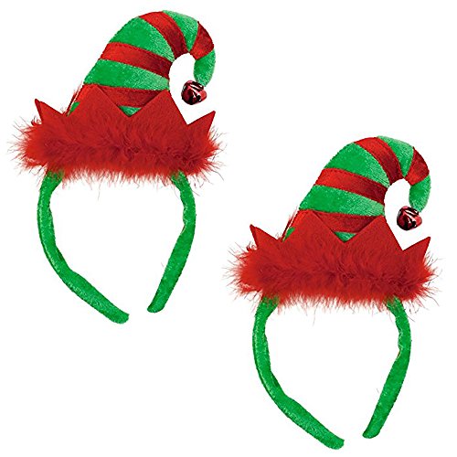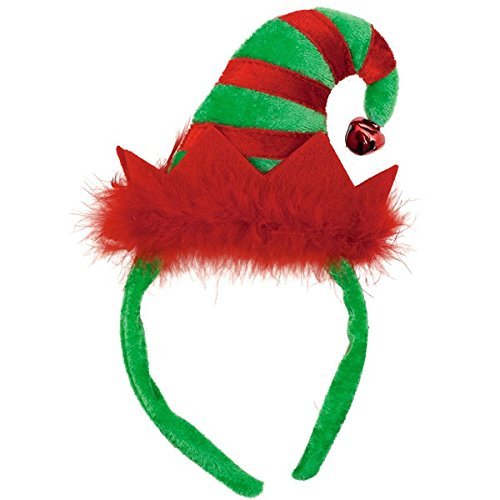 Product Description Positively elfin! Our Elf Hat Headband packs a mighty holiday wallop with Christmas striping on the velour peak, a dangling jingle bell at the tip and red marabou lining the crown. Mounted on a flexible plastic headband covered with plush velour. Includes (2) Mini Elf Headband by Amscan. Measures 9" x 5" and fits most adults. 0