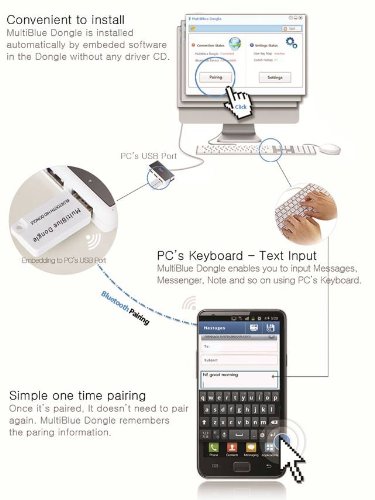 Multiblue Dongle allows to type on Android or Apple devices using your PC or laptop keyboard & mouse. You can chat with your friends and family, insert characters, and copy the contents from your computer and paste them to smart devices at ease. You just need to plug it in to one of your USB ports in your PC or laptop and follow simple steps to make it work. Multiblue Dongle is compatible with most of smart devices supporting Bluetooth HiD profile such as Samsung Galaxy, Galaxy Nexus and Galaxy S, S2, S3, Tab 7 and Tab 10.1 and iPhone 3G, iPhone 3GS, iPhone 4, iPhone 4S, iPhone 5, iPad 1, iPad2, iPad3, iPad4, iPad5, iPad mini and Motorola Droid. MultiBlue Dongle can be paired with up to 4 smart devices enabling them to be controlled all from your PC Keyboard and Mouse . You don't need additional dongle to add.Feature