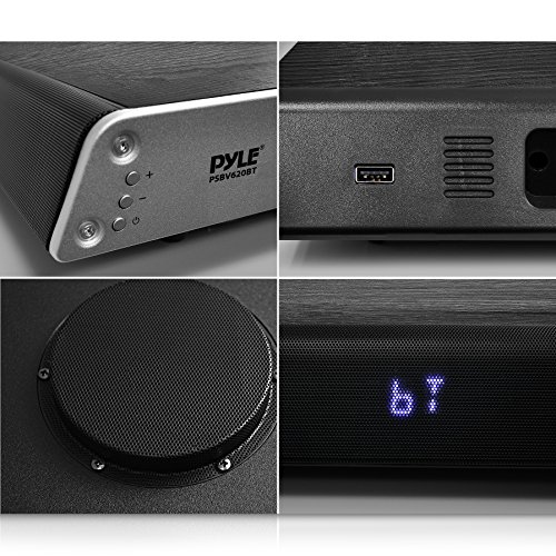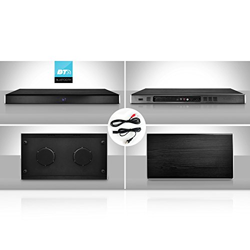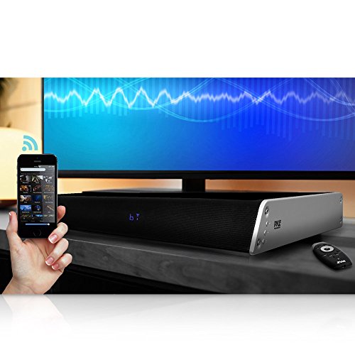 The Pyle Bluetooth TV Sound Base Speaker System enhances your home theater experience. This powerful yet compact sound base is designed to sit under your television -- and it's super easy-to-setup & easy-to-use! Built-in Bluetooth allows you to wirelessly stream audio from all of your favorite devices (like Smartphones, Tablets, Laptops, Computers, etc.). The sound base features exceptional stereo sound reproduction technologies that effectively recreate the entire audio spectrum in a compact, form-fitting space. Full range audio is created thanks to the high-powered dual 5.0'' ported enclosure subwoofers and four 1.5'' speakers, all made for adding rich sounds to your next movie night! Let Pyle improve your audio & multimedia experience by adding clean and simple style -- with next-generation sound technology. Upgrade your home theater entertainment system with the Pyle Bluetooth TV Sound Base Speaker System.Feature