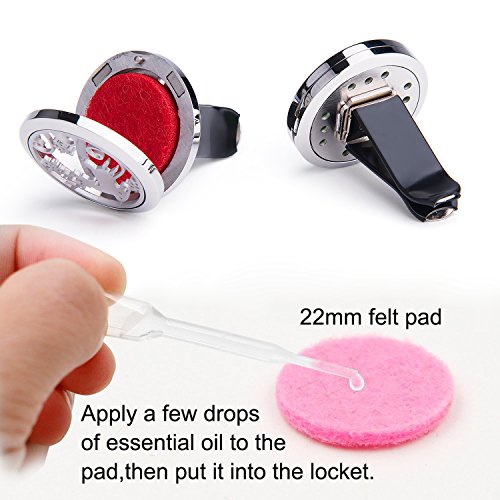 - ☆Easy to use : Apply a few drops of your essential oil to one felt pad, put it inside the 30mm car locket. Relieve your stress and keep alert when you drive. Aroma around you, bring you good mood. Minimize some smell you don’t like. Use your favorate essential oil to enjoy your daily life, your trip.