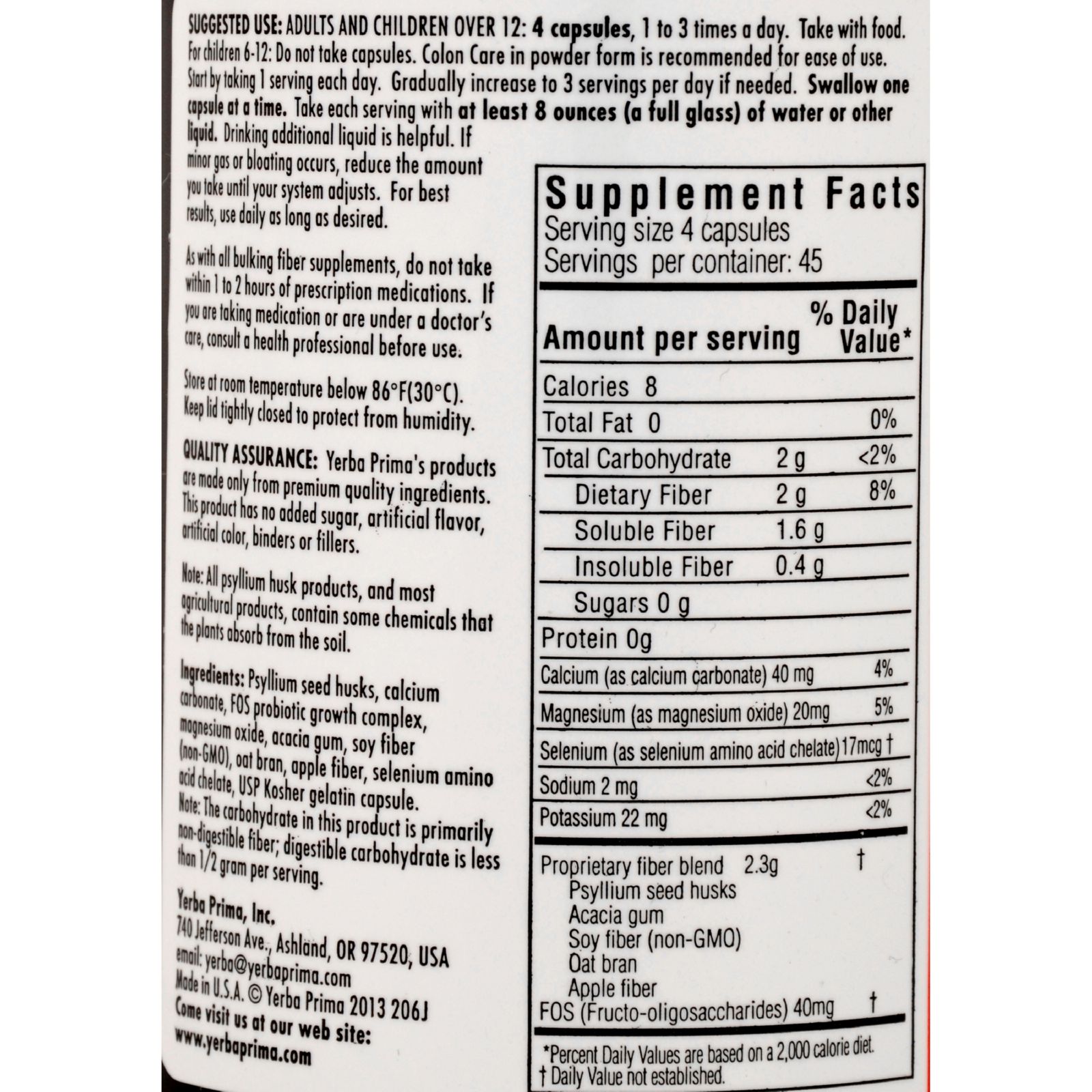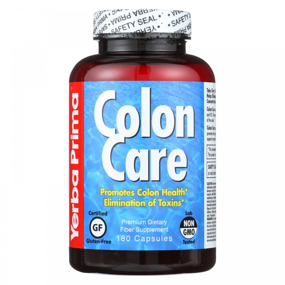 Yerba Prima Colon Care Description: Promotes Colon Health Elimination of Toxins Colon Care Caps promotes colon health with fiber, calcium, magnesium, selenium and FOS. These nutrients provide dietary support for normal, healthy functioning of the colon, including regular elimination of toxins and waste material, promoting the growth of friendly bacteria, such as acidophilus and bifidus, and support for proper digestion. For best results, use everyday as long as desired. No added sweeteners, colors or additives. Disclaimer These statements have not been evaluated by the FDA. These products are not intended to diagnose, treat, cure, or prevent any disease. Ingredients : Psyllium Seed Husks, Calcium Carbonate, FOS Probiotic Growth Complex, Magnesium Oxide, Acacia Gum, Soy Fiber, Oat Bran, Apple Pectin Extract, Selenium Amino Acid Chelate, USP Kosher Gelatin Capsule. Size : 180 CAP Pack of : 1